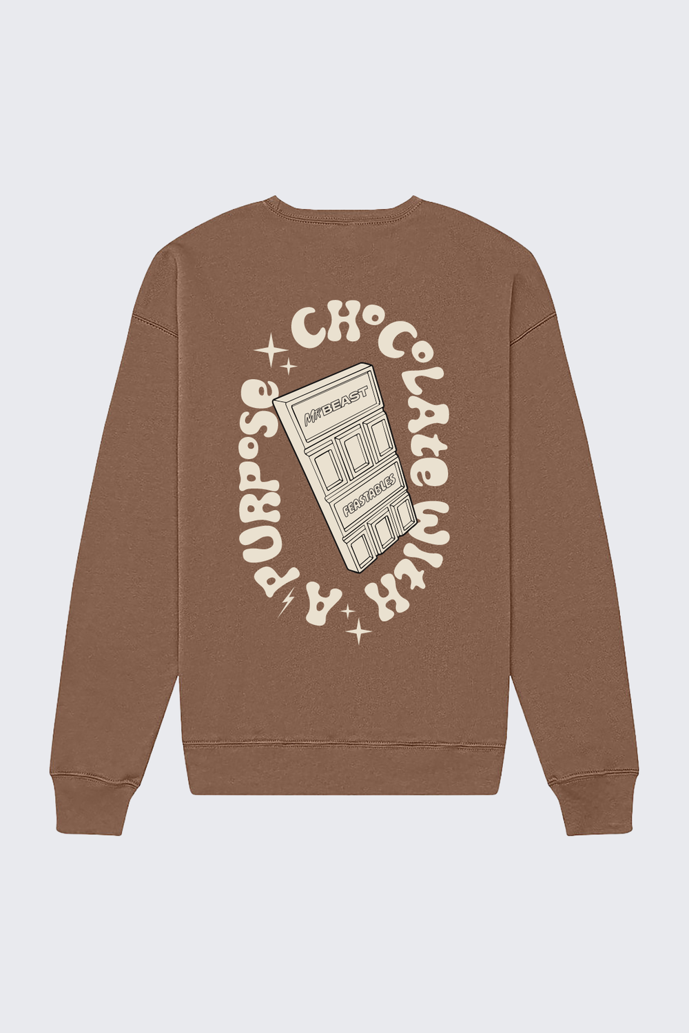 Bring classic vibes to your Feastables collection with this retro-style brown crewneck. The front features the bright FEASTABLES logo, while the back showcases the playful “Chocolate With A Purpose” graphic for a bold, nostalgic look. With its vintage colorway and standout branding, this crewneck is the perfect mix of old-school style and Feastables fun.