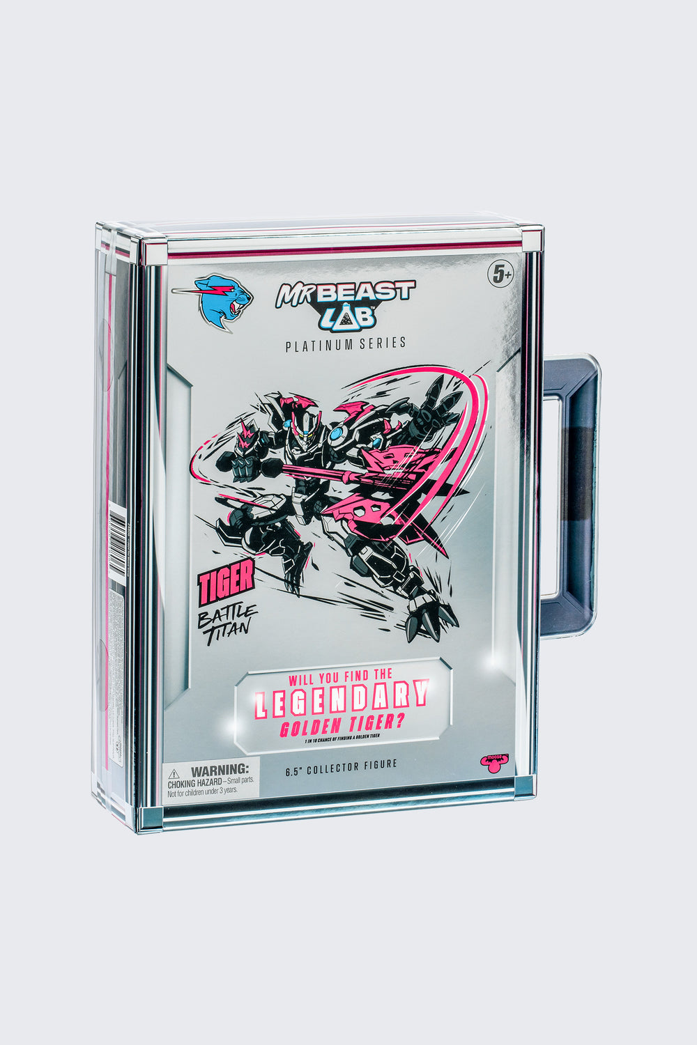 Introducing the MrBeast Lab Platinum Series: Lift off the iconic MrBeast briefcase sleeve to reveal the Tiger Battle Titan Collector Figure. The MrBeast Lab Platinum Series Tiger Collector Figure stands at 6.5" (16.5cm) tall.