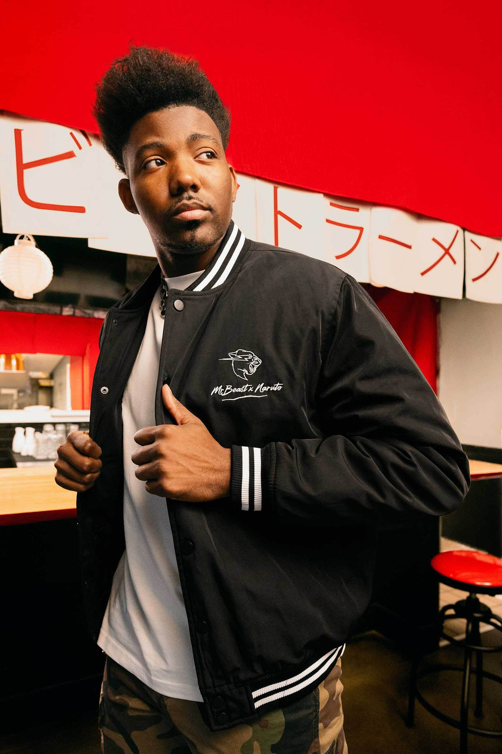 The clean black silhouette keeps it timeless, while the contrast details tell the story. On one side, the kanji insignia, a nod to NARUTO’s hidden leaf village. On the other side, the MrBeast mark, a symbol of ambition, impact, and pushing limits in the real world.